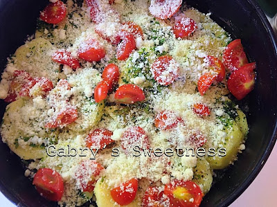 Conditele con il formaggio, i pomodorini tagliati a pezzetti, un pò di aglio, abbondante prezzemolo tritato, pepate ed irrorate senza risparmio con l’olio.