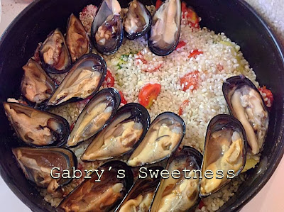 Su questo strato, stendete metà del riso pesato, ordinatamente, e su di esso le cozze, come da foto, fino a coprire interamente il riso stesso.